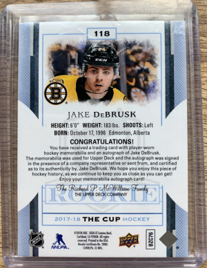 2017-18 The Cup Jake Debrusk Rookie Patch Auto /249