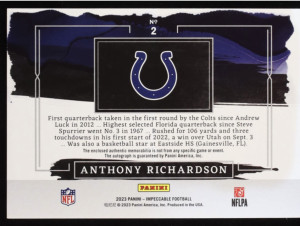 Anthony Richardson 2023 Panini Impeccable Elegance Rookie Helmet and Patch Autographs #2 RC #38/75