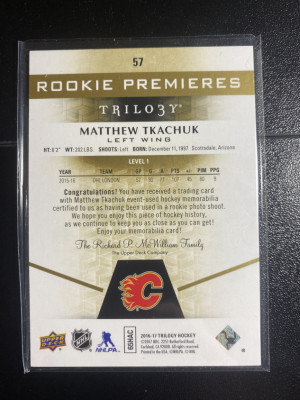 Matthew Tkachuk 16-17 Trilogy Rookie Premiers Jersey Level 1 164/399