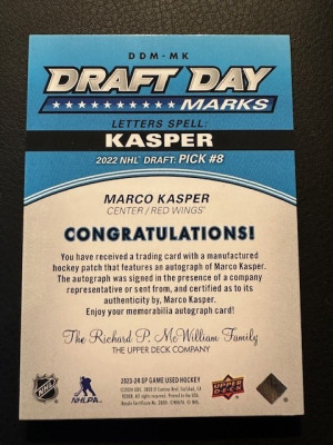 2023-24 SP Game Used - Marco Kasper - Draft Day Marks - DDM-MK