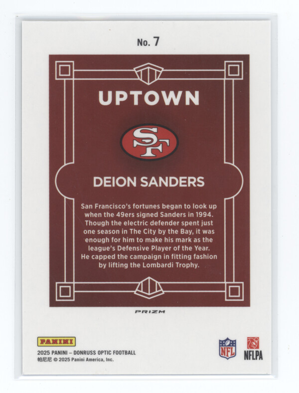 You are purchasing a 2025 Donruss Optic Football Uptown Deion Sanders #7. You will receive the exact item in the photographs. Thank you for looking.
