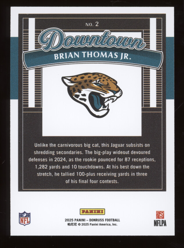 You are purchasing a 2025 Panini Donruss Football Downtown Brian Thomas Jr. #2. You will receive the exact item in the photographs. Thank you for looking.