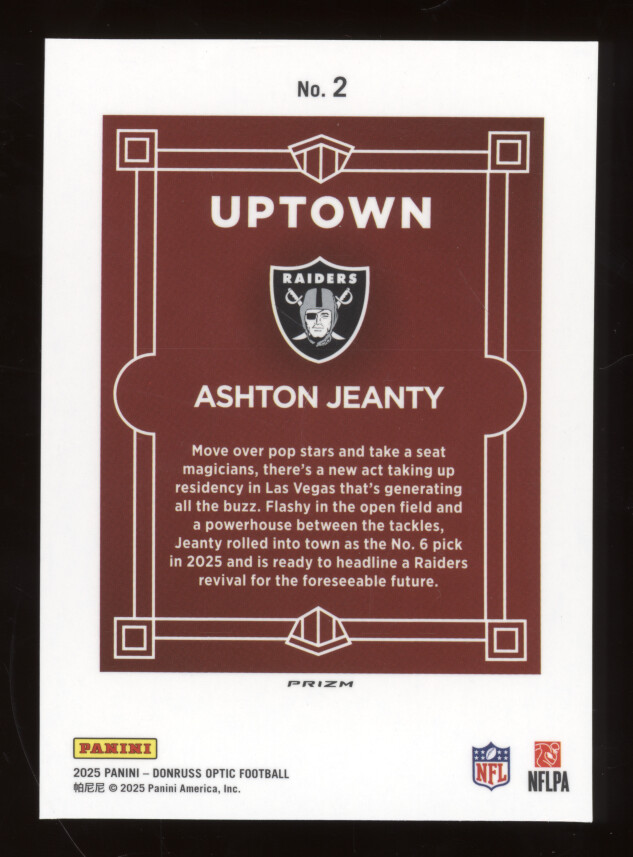 You are purchasing a 2025 Donruss Optic Uptown Ashton Jeanty #2 RC. You will receive the exact item in the photographs. Thank you for looking.