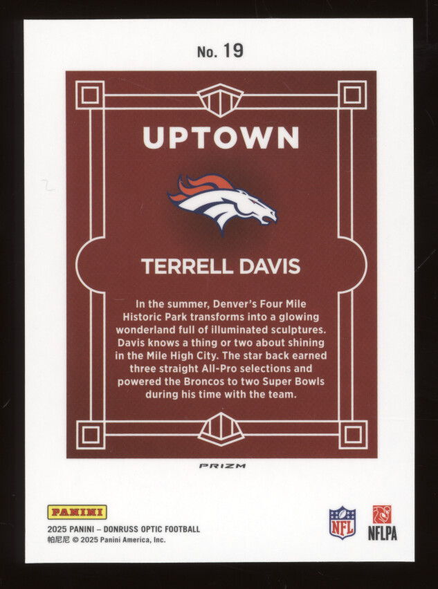 You are purchasing a 2025 Donruss Optic Uptown Terrell Davis #19. You will receive the exact item in the photographs. Thank you for looking.