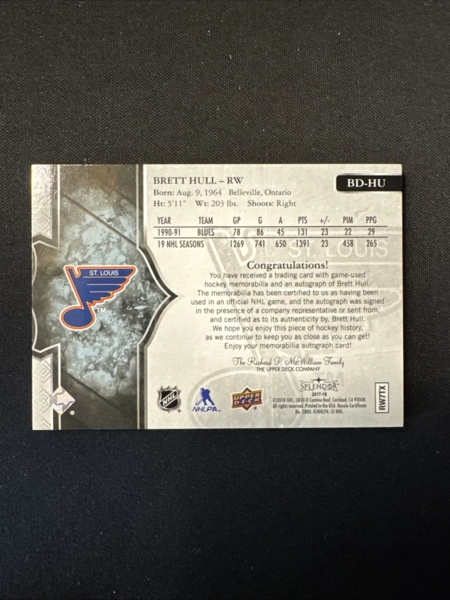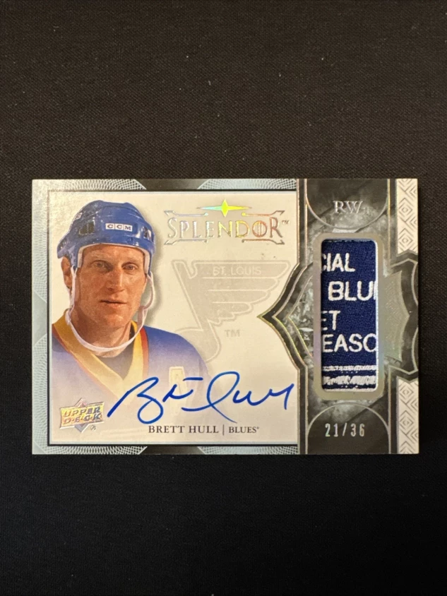 The product is a 2017-18 Upper Deck Splendor trading card featuring autographed patch relic of Brett Hull from the St. Louis Blues. This single card has a print run of 36, is part of an original set by Upper Deck, and is authenticated by Upper Deck as well. The autograph is hard signed and the card is a relic variety, making it a valuable and collectible item for fans of ice hockey and sports trading cards.
