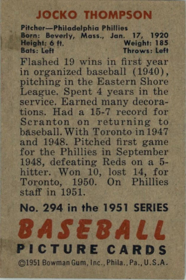 1951 Bowman #294 Jocko Thompson - VG-EX