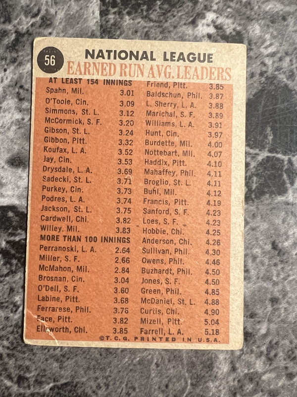 1962 Topps #56 NL ERA Leaders Warren Spahn/O’toole/Simmons/McCormick Good Condition