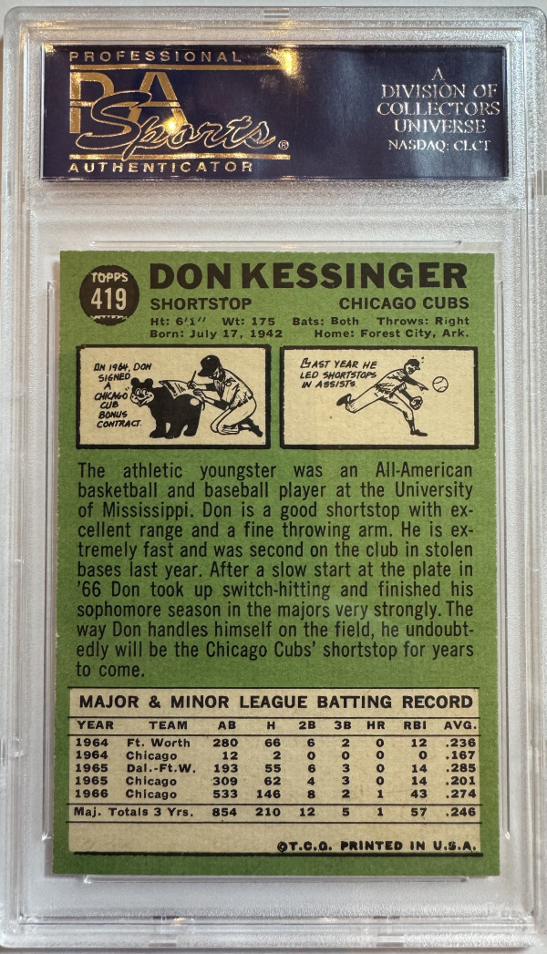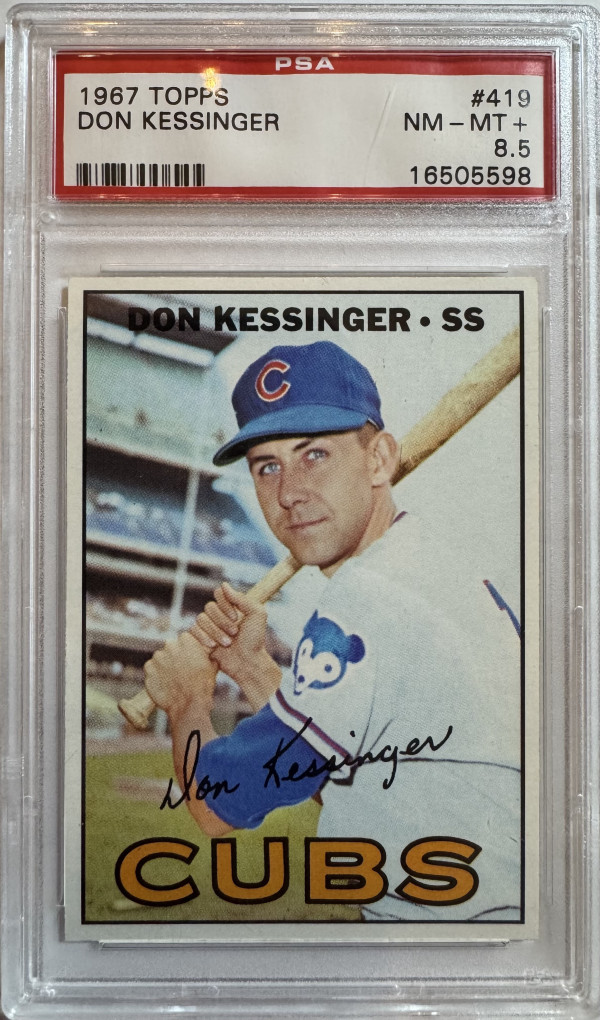 The product is a 1967 Topps #419 Don Kessinger Chicago Cubs trading card graded as PSA 8.5. This vintage baseball card features the player Don Kessinger from the Chicago Cubs during the 1967 season. Made of card stock and an original licensed reprint by Topps, this rare grade card is a valuable addition to any sports trading card collection, especially for fans of the Major League Baseball and collectors of vintage baseball memorabilia.