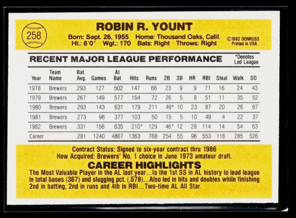 You are purchasing a 1982 Donruss Robin Yount #258. You will receive the exact item in the photographs. Thank you for looking.