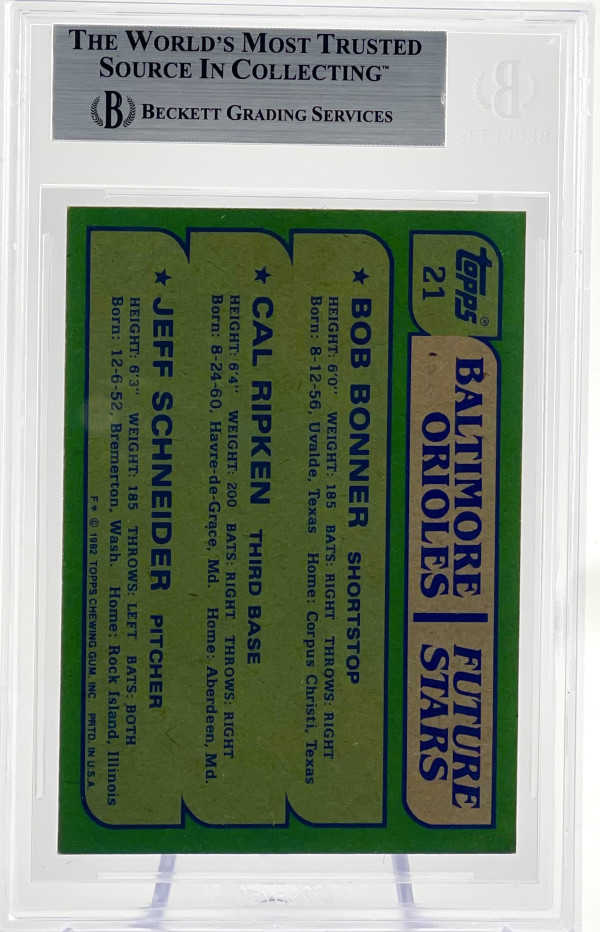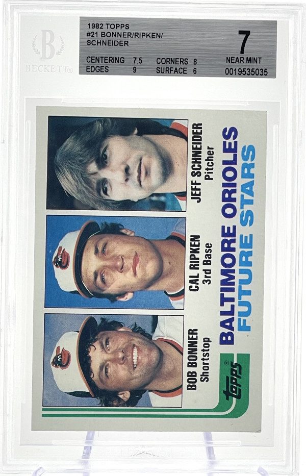 The product is a 1982 Topps baseball trading card featuring future stars Cal Ripken, Jeff Schneider, and Bobby Bonner from the Baltimore Orioles. This particular card is designated as card number 21 in the set and holds a grade of 7, with professional grading from Beckett Grading Services. As a rookie card, it holds value for collectors interested in vintage baseball cards, especially those featuring players who went on to have successful careers in Major League Baseball.