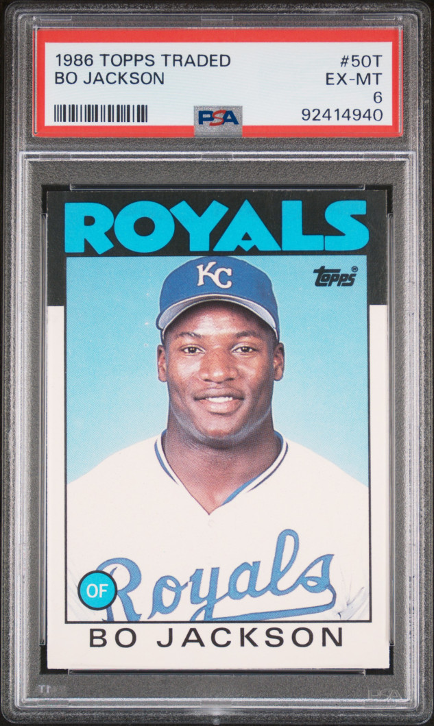 The 1986 Topps Traded Bo Jackson #50T (Rookie) PSA 6 trading card is a highly sought-after collectible for baseball fans and card collectors alike. This standard-sized card features Bo Jackson, a standout player from the Major League (MLB) team, the Kansas City Royals. Graded as a 6 by PSA, this card is a valuable piece of sports memorabilia from the 1986 season, making it a must-have for any fan of Bo Jackson or the Topps Traded set.