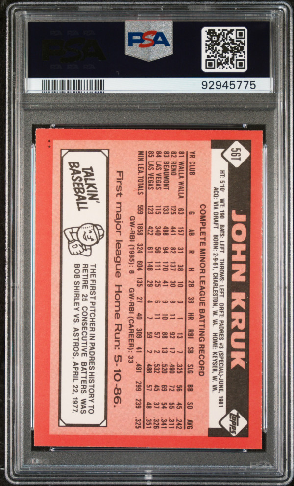 You are purchasing a 1986 Topps Traded John Kruk #56T PSA 9. You will receive the exact item in the photographs. Thank you for looking.