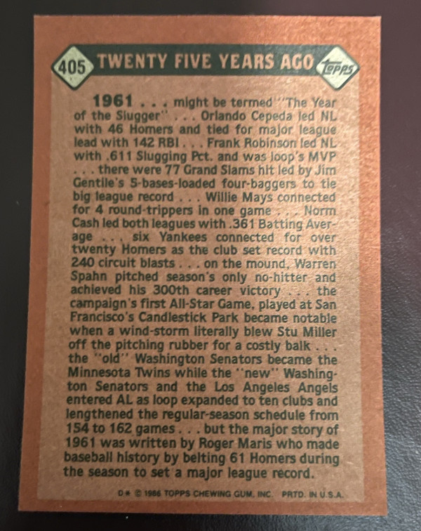 1986 Topps - Turn Back The Clock Roger Maris #405