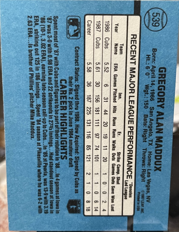 1988 Donruss Baseball Greg Maddux #539 Chicago Cubs