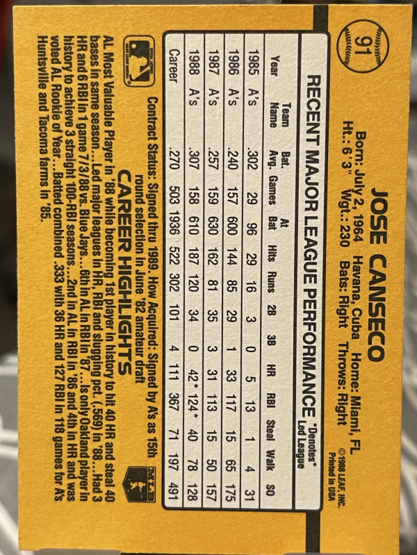 1989 Donruss Jose Canseco #91 *Denotes* Next To Performance