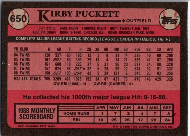 This is a nice example of a 1989 Topps #650 Kirby Puckett