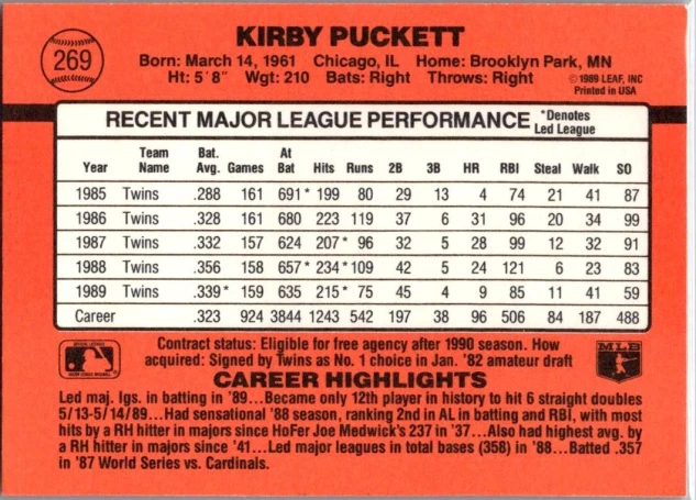 This is a nice example of a 1990 Donruss #269c Kirby Puckett