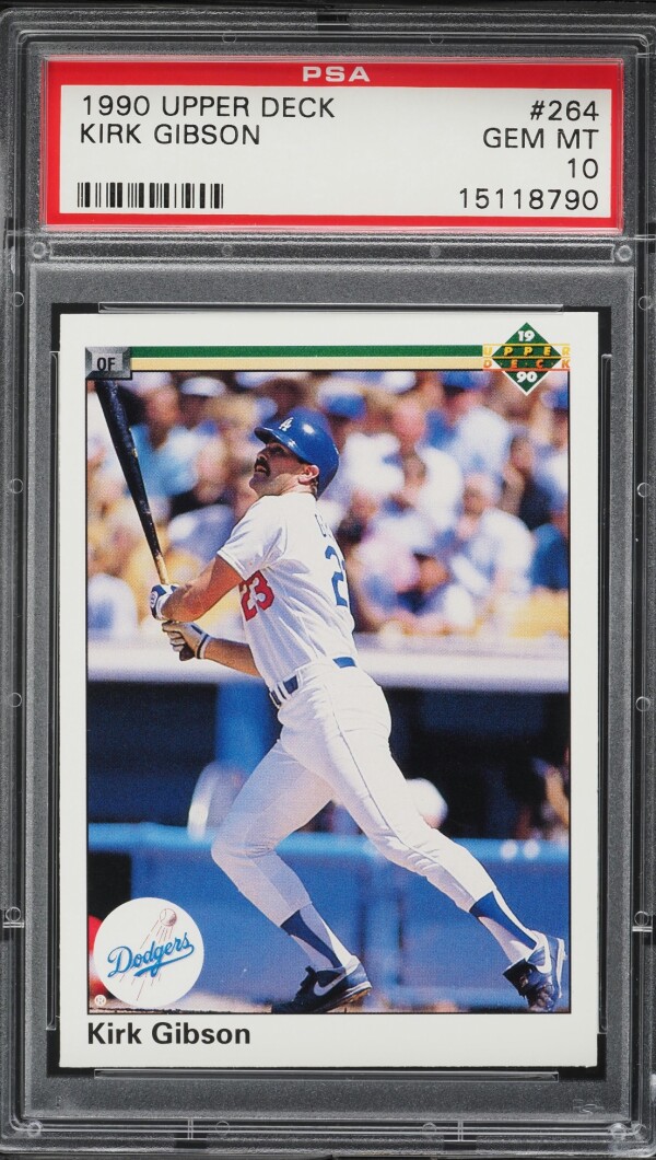 The product is a 1990 Upper Deck trading card featuring Kirk Gibson from the Los Angeles Dodgers in Major League Baseball. This card is part of the base set for that season and has been professionally graded for authenticity and condition. The card number is 264 and it is a valuable collectible for fans of baseball and sports trading cards. Kirk Gibson is a significant player in baseball history, making this card a desirable piece for collectors.