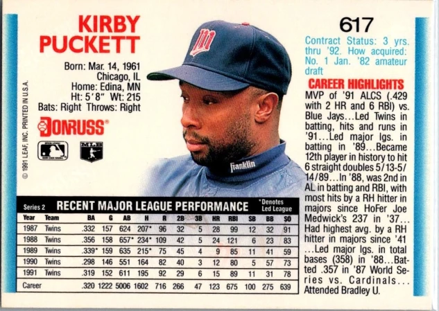 This is a nice example of a 1992 Donruss #617 Kirby Puckett