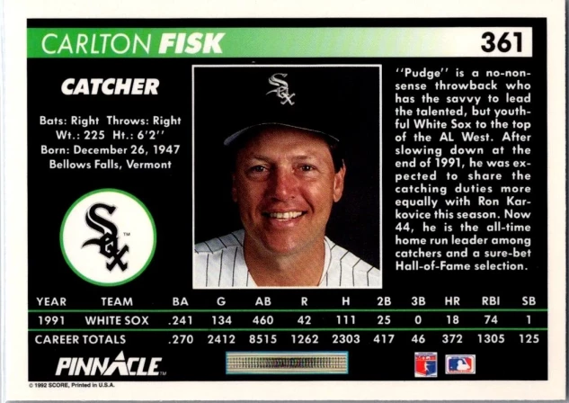 This is a nice example of a 1992 Pinnacle #361 Carlton Fisk