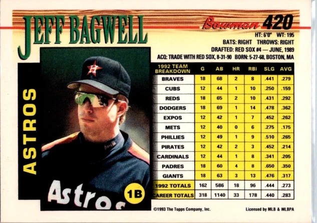 This is a nice example of a 1993 Bowman #420 Jeff Bagwell