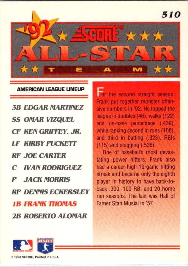 This is a nice example of a 1993 Score #510 Frank Thomas