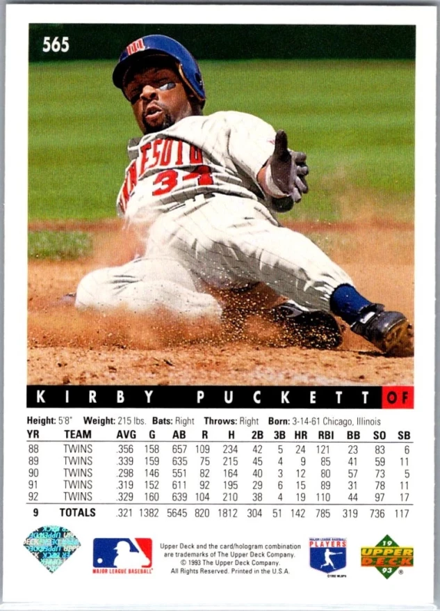 This is a nice example of a 1993 Upper Deck #565 Kirby Puckett Gold Hologram