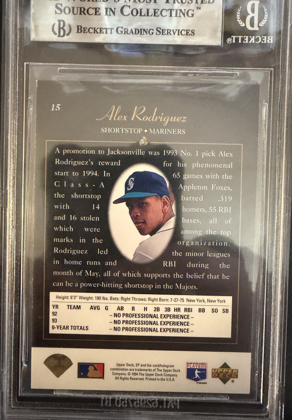 You are purchasing a 1994 SP #15 Alex Rodriguez BGS 8.5 NM-MT. Upon purchase you will receive the exact card pictured. Thanks!
