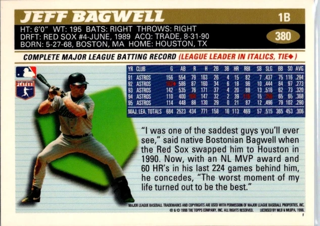 This is a nice example of a 1996 Topps #380 Jeff Bagwell