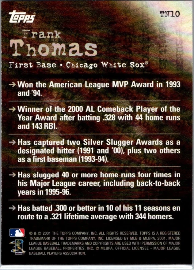 This is a nice example of a 2001 Topps #TN10 Frank Thomas Noteworthy