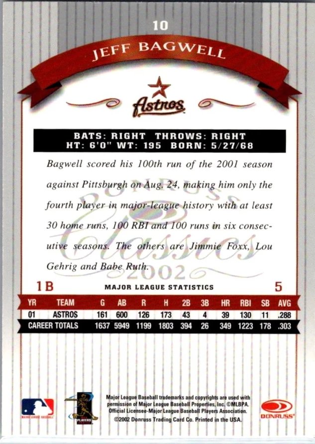 This is a nice example of a 2002 Donruss Classics #10 Jeff Bagwell