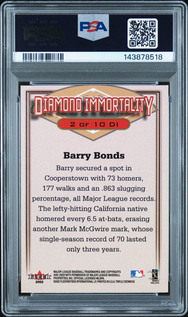 You are purchasing a 2002 Fleer Triple Crown Diamond Immortality Barry Bonds PSA 9. You will receive the exact item in the photographs. Thank you for looking.