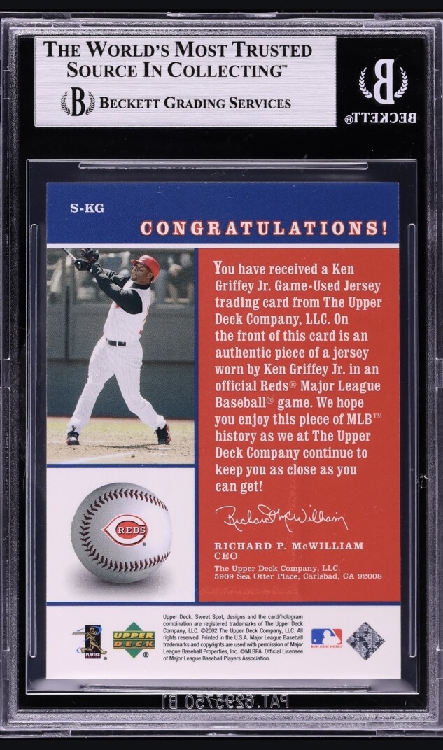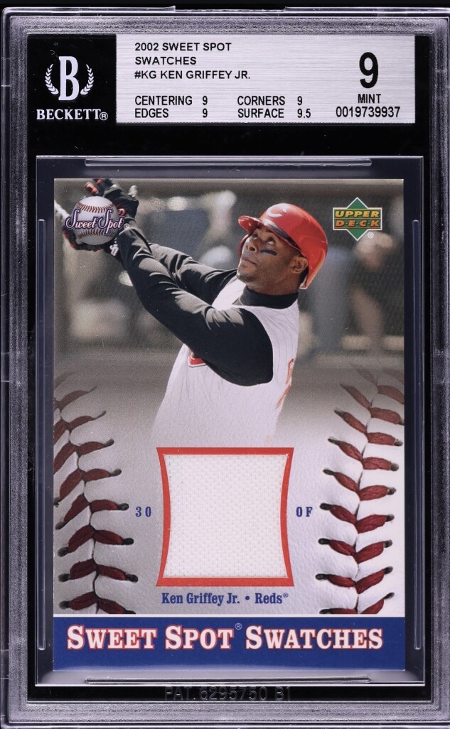 The product is a 2002 Upper Deck Sweet Spot trading card featuring Ken Griffey Jr from the Cincinnati Reds. This card is part of the Swatches insert set, showcasing a piece of memorabilia from the player. Graded as a 9 by Beckett Grading Services, this baseball trading card is a valuable collectible for fans and collectors of Major League Baseball memorabilia.
