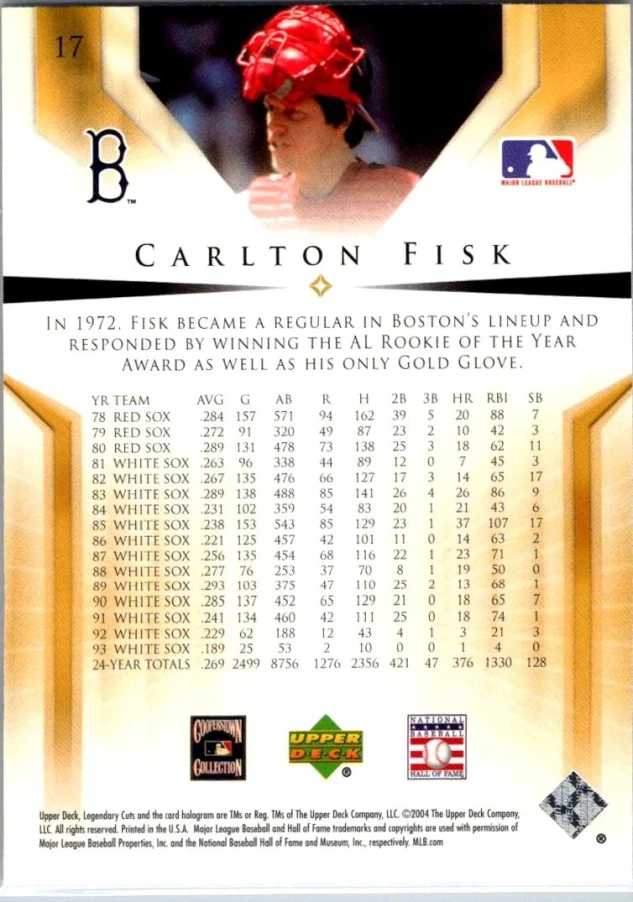 This is a nice example of a 2004 SP Legendary Cuts #17 Carlton Fisk
