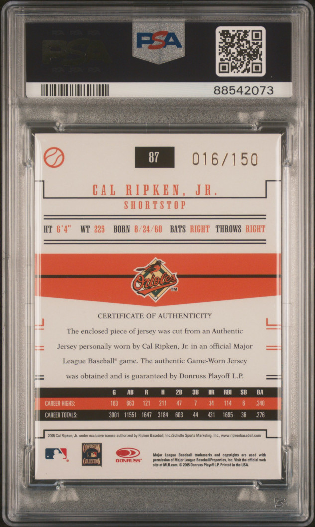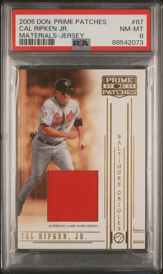 The product is a 2005 Prime Patches Baseball trading card featuring a jersey relic of Cal Ripken Jr. from the Baltimore Orioles. Manufactured by Donruss/Playoff as part of the Major League Materials insert set, this limited edition card has a print run of 150 and is graded PSA 8. The card is a sports memorabilia item that is a must-have for baseball fans and collectors alike, showcasing a piece of the legendary player's jersey in a unique and collectible format.