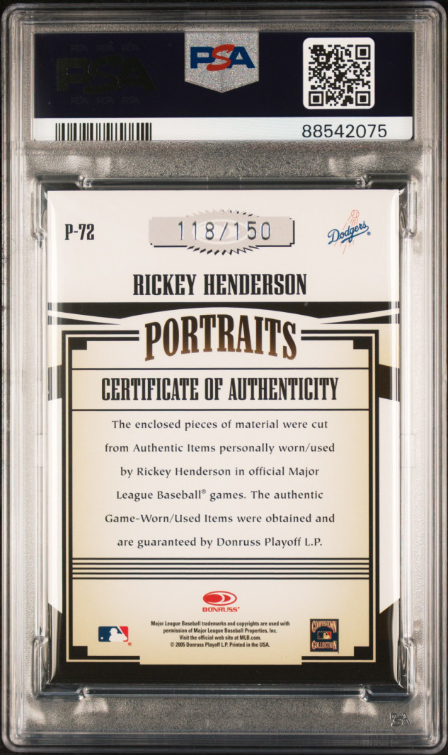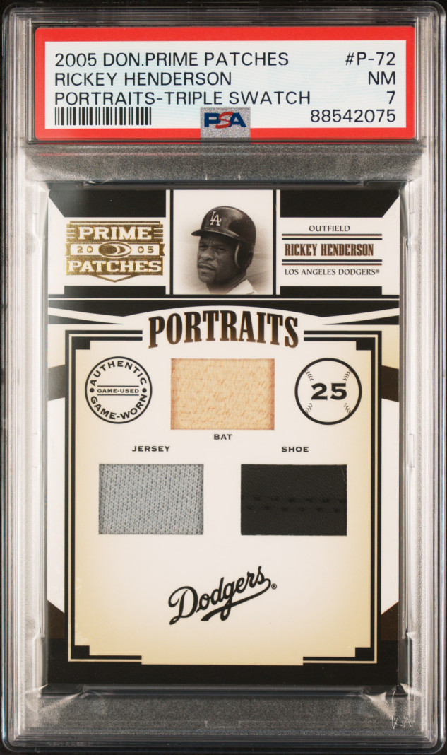 2005 Donruss Prime Patches Rickey Henderson Game Worn Triple Material /150 PSA 7