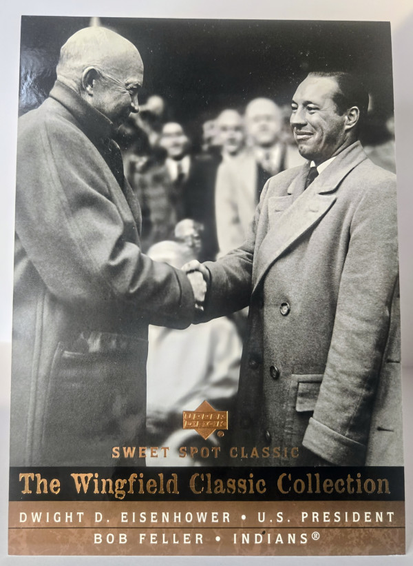 The product is a 2005 Upper Deck Sweet Spot Classic trading card featuring Dwight D. Eisenhower and Bob Feller from the Major League Baseball (MLB). This oversized card is part of the Wingfield Classic Collection insert set and is numbered WCC-8. Manufactured by Upper Deck, the card includes special features and belongs to the Cleveland Guardians team. This unique sports trading card captures a piece of baseball history from the 2005 season.