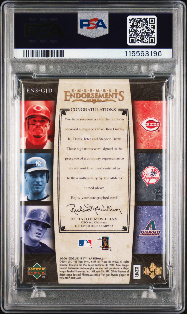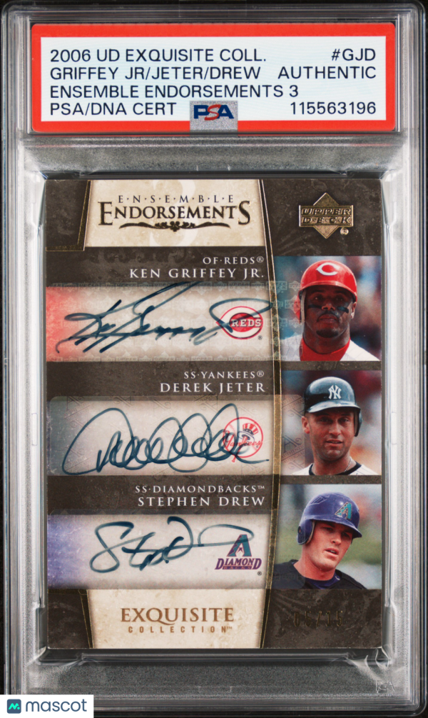 You are purchasing a 2006 UD Exquisite Collection Ensemble Endorsements 3 Drew Jeter Griffey JR #GJD 05/15 PSA A Auto A. You will receive the exact item in the photographs. Thank you for looking.