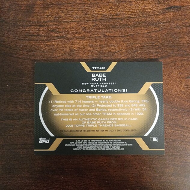 You are purchasing a 2008 Topps Triple Threads Babe Ruth. You will receive the exact item in the photographs. Thank you for looking.