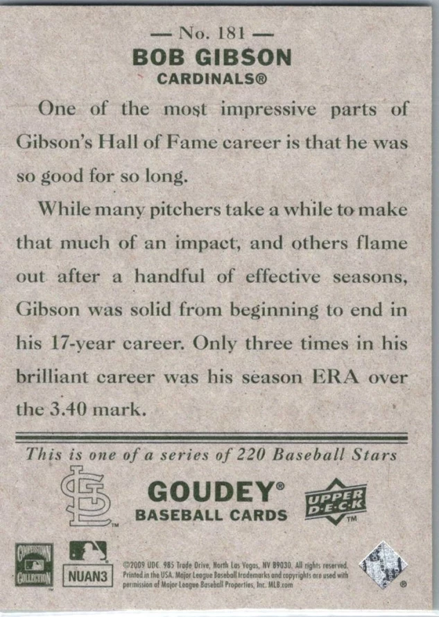 This is a nice example of a 2009 Upper Deck Goudey #181 Bob Gibson