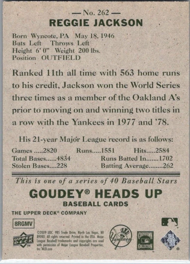 This is a nice example of a 2009 Upper Deck Goudey #262 Reggie Jackson