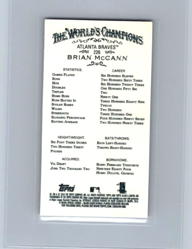 This is a nice example of a 2010 Topps Allen & Ginter #226 Brian McCann Mini Black Border