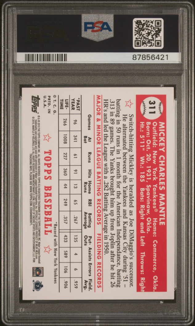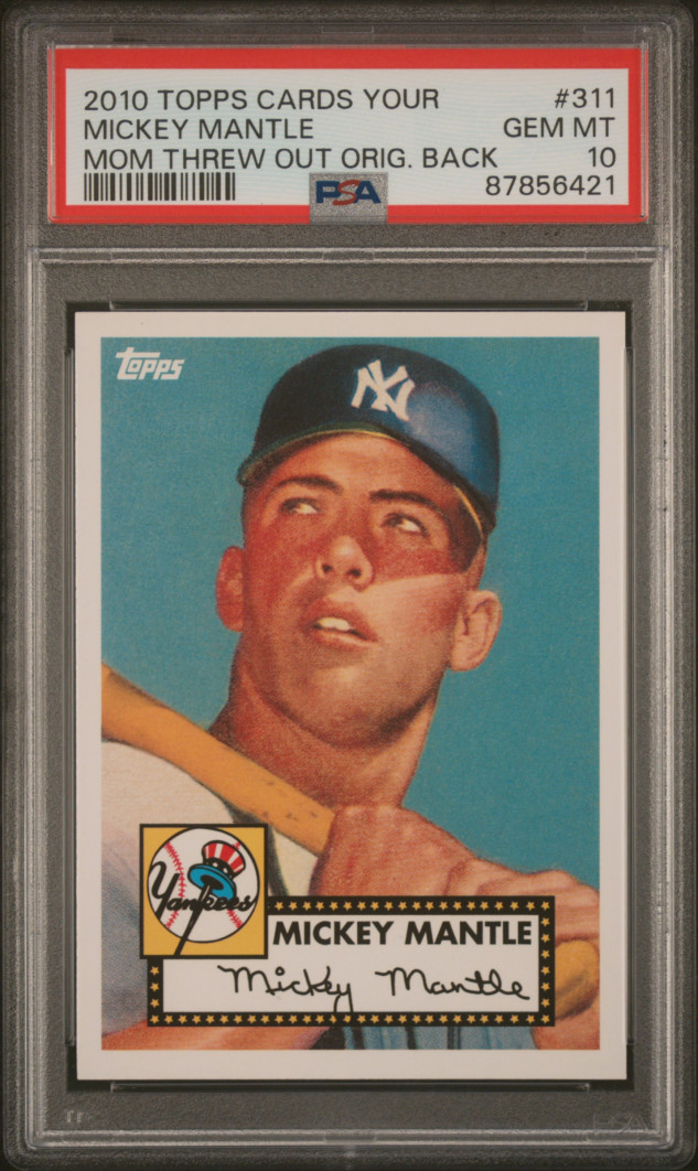 The product is a PSA 10 graded 2010 Topps trading card featuring Mickey Mantle from the New York Yankees. This card is part of the "The Cards Your Mom Threw Out" insert set and has an original back design. The card is made of card stock and manufactured by Topps in the United States. It is a standard-sized sports trading card in English language, featuring the New York Yankees team. This collectible item is a valuable addition to any baseball card collection, especially for fans of Mickey Mantle and the Topps brand. Low POP extremely valuable and great investment!