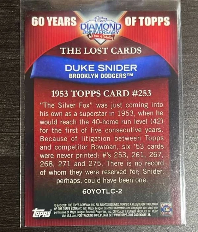 This is a nice example of a 2011 Topps - 60 Years of Topps: The Lost Cards #60YOTLC-2 Duke Snider