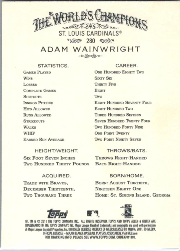 This is a nice example of a 2011 Topps Allen & Ginter #280 Adam Wainwright
