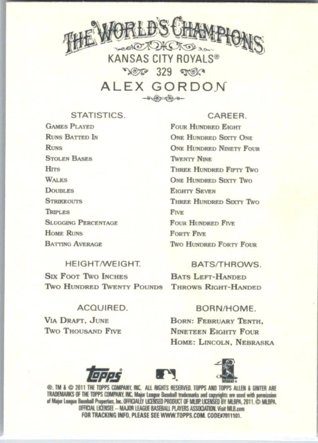 This is a nice example of a 2011 Topps Allen & Ginter #329 Alex Gordon Code Cards
