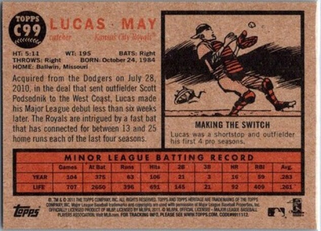 This is a nice example of a 2011 Topps Heritage #C99 Lucas May Black