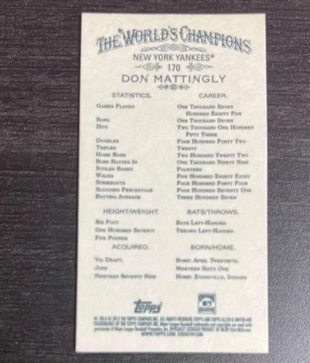 This is a nice example of a 2012 Topps Allen & Ginter - Mini #170 Don Mattingly