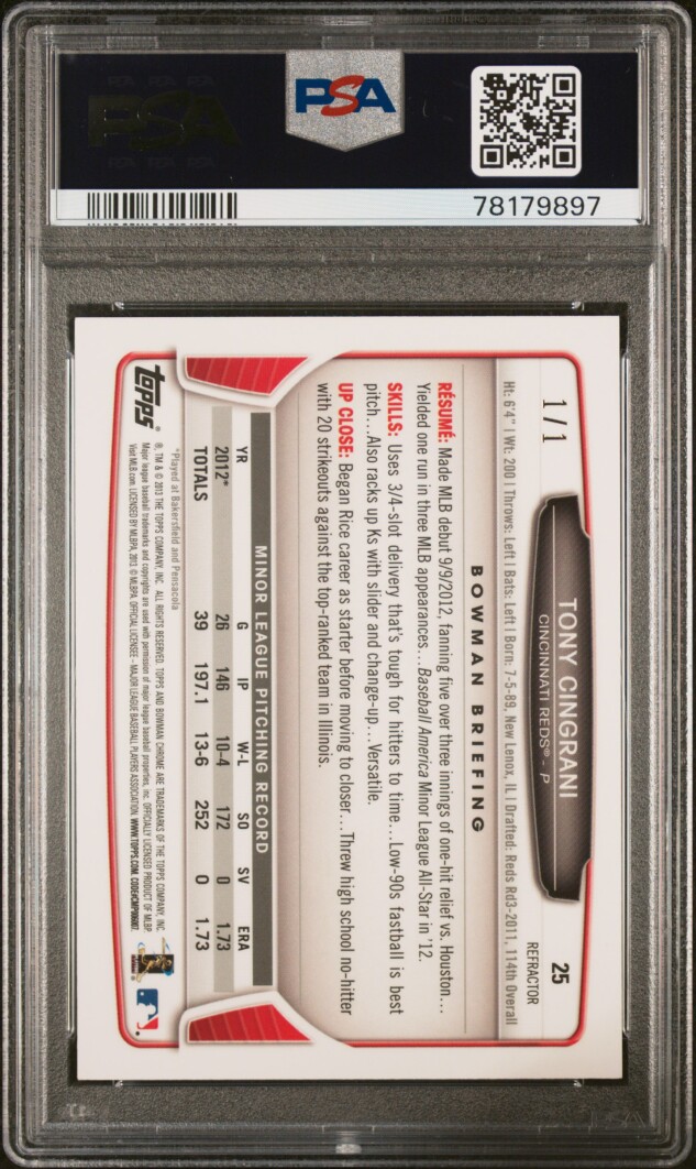 The 2013 Bowman Chrome Draft Picks Superfractor Tony Cingrani ROOKIE 1/1 #25 PSA 9 M is a highly sought-after sports trading card featuring an autograph from Tony Cingrani, a rookie player for the Cincinnati Reds. This card is a unique 1/1 superfractor parallel, graded as a PSA 9, making it a valuable collectible for baseball fans and collectors. The card is made of sturdy card stock with a 35 Pt. thickness, and the autograph is hard-signed by Tony Cingrani, ensuring its authenticity. This rare find from Topps is backed by authentication from Beckett Grading Services, adding to its appeal and value for fans of Major League Baseball.