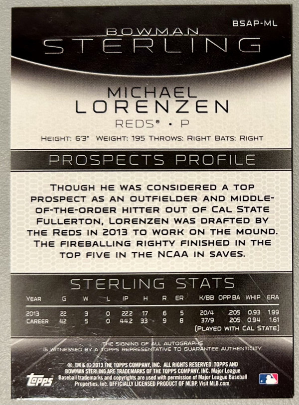 2013 Bowman Sterling Prospect Auto MICHAEL LORENZEN #BSAP-ML Reds / Royals